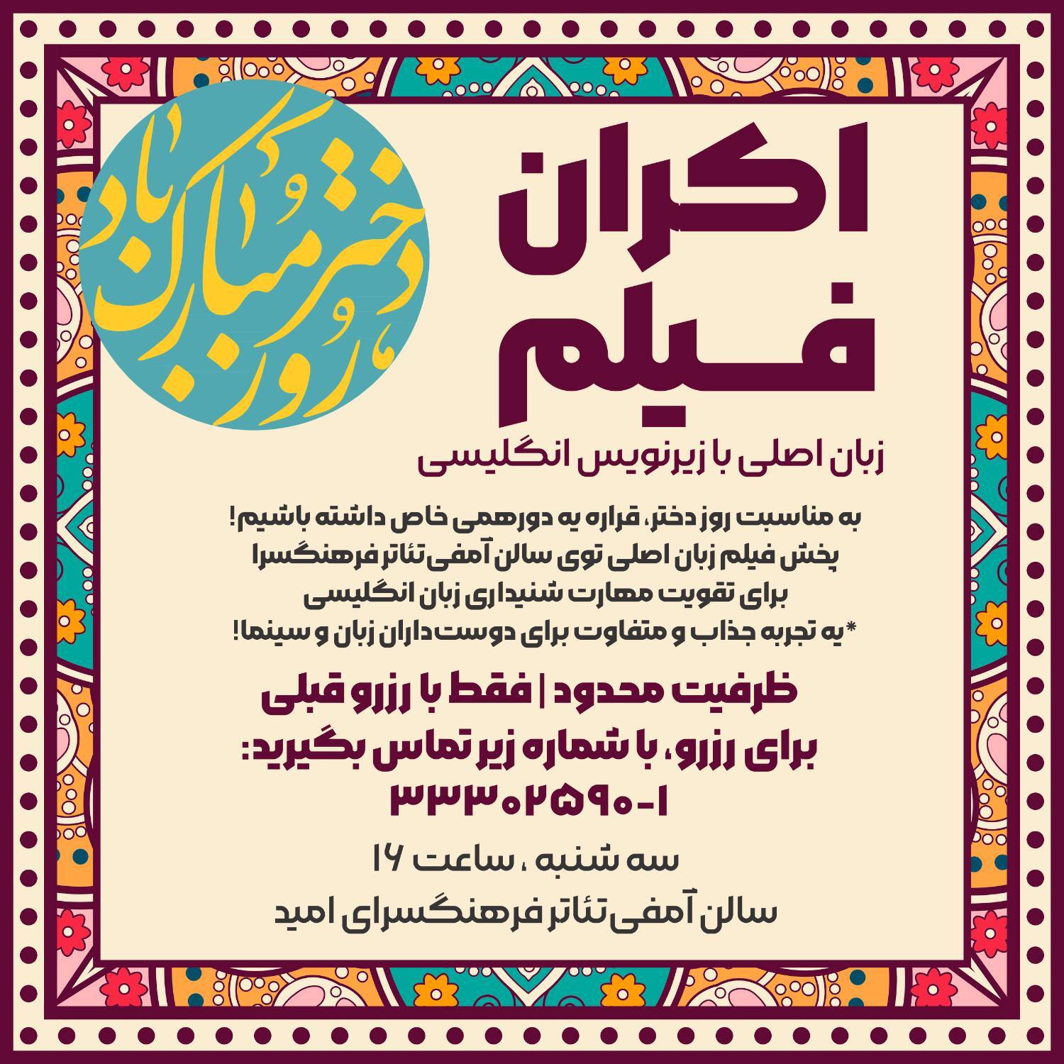 همزمان با گرامیداشت روز دختر اکران یک فیلم زبان اصلی با زیرنویس انگلیسی در سالن آمفیتئاتر تجربهای متفاوت و جذاب برای نوجوانان فرهنگسرای امید رقم میزند.